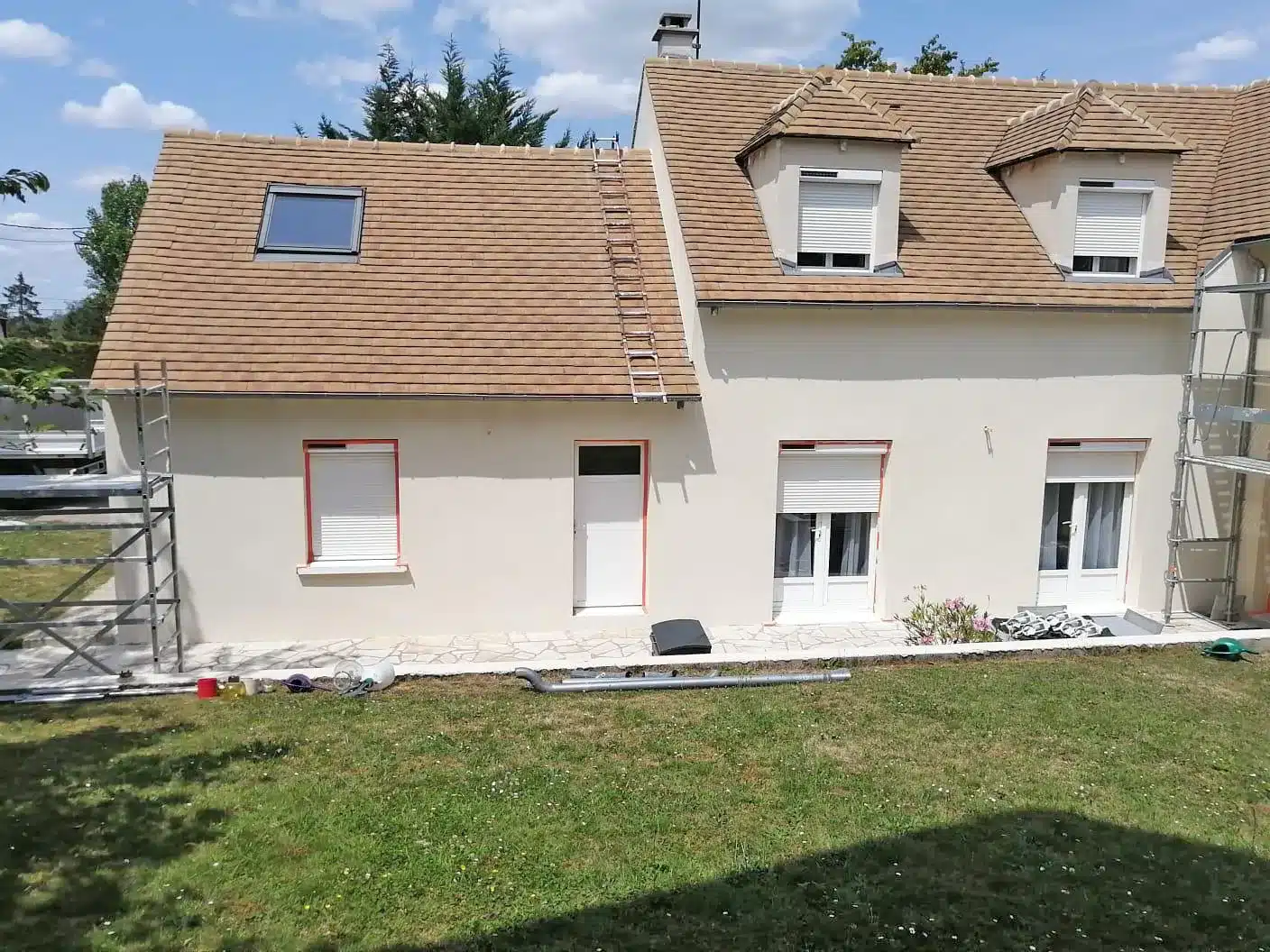 Finition et protection hydrofuge pour façade rénovée à Vernouillet avec des protections et échafaudage