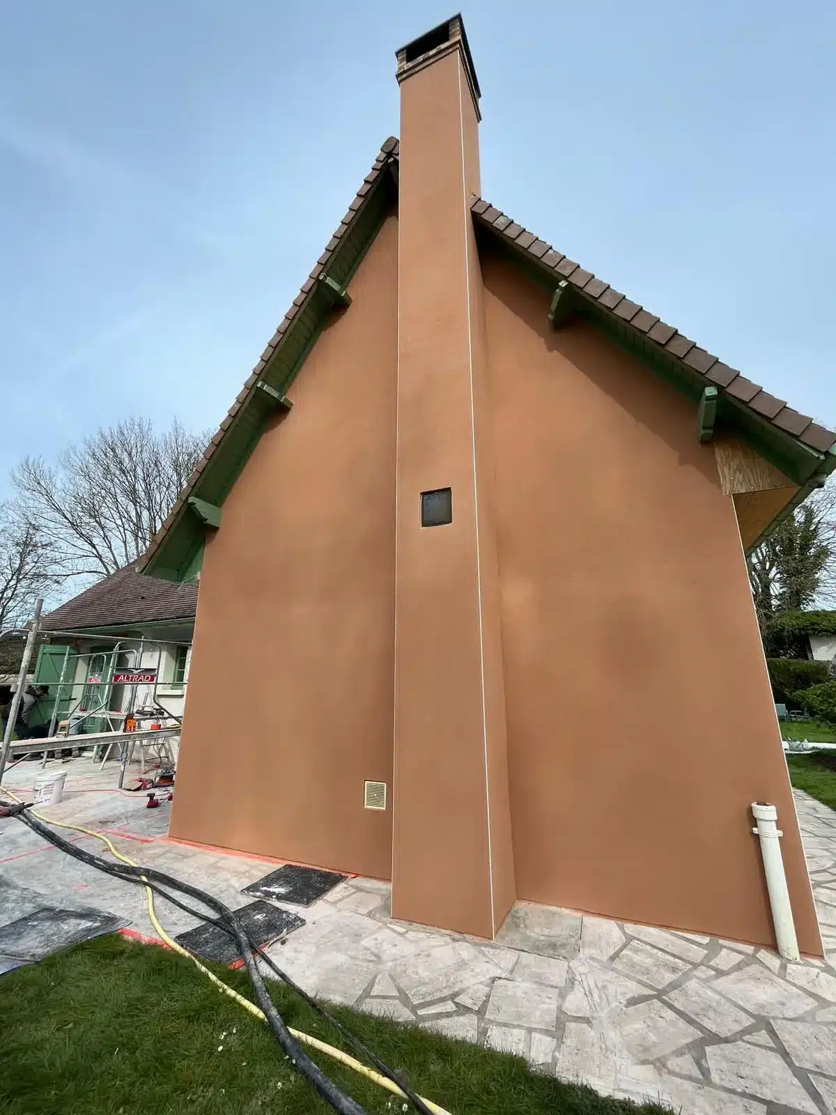 - Projection de l’enduit : application de l’enduit monocouche sur les façades à l’aide de la machine à projeter, assurant une couche uniforme et régulière.